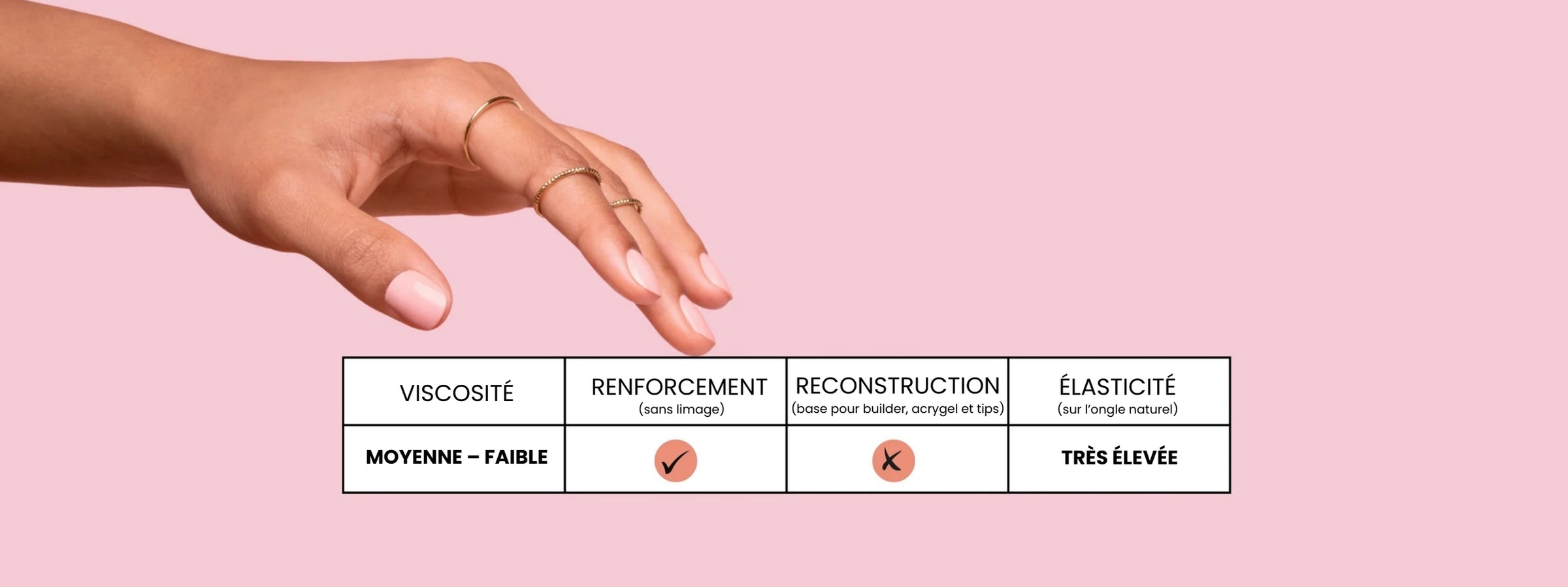 Grâce à son élasticité, la base est idéale pour le semi-permanent avec renforcement ou par exemple pour réaliser un babyboomer en structure